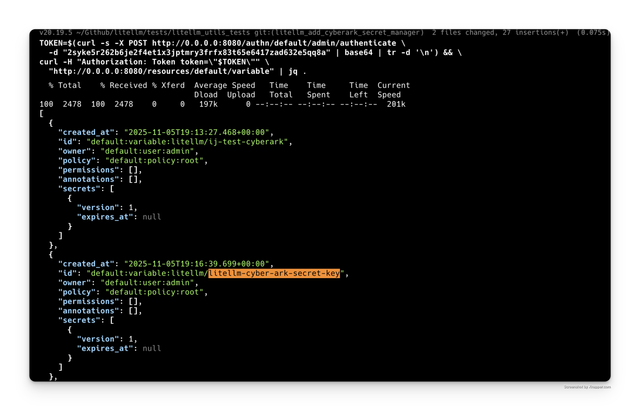 The response shows litellm-cyber-ark-secret-key exists in CyberArk: