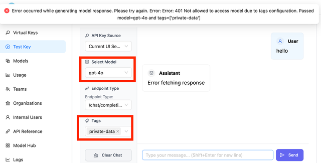 This request will fail since we send tags=private-data but the model gpt-4o is not in the allowed models for the private-data tag.
